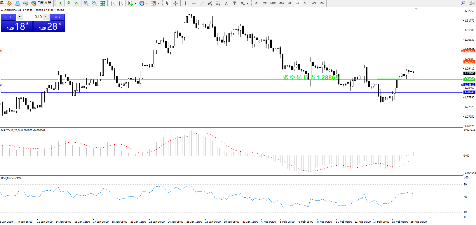 美元指数自高位回落带动英镑兑美元持续反弹,目前交投于1.2930附近,中美贸易谈判乐观预期进一步升温,导致美元持续自上周五(215)录得的年内新高97.38回落,为英镑反弹的主因所在。此外英国内阁大臣戴维·利丁顿上周在布鲁塞尔表示,他的经验是,关于英国脱欧的谈判不只是礼遇,这表明英国政府可能会重新协商脱欧协议,或推迟原定于329日的脱欧期限,这一表态也为英镑提供支撑。