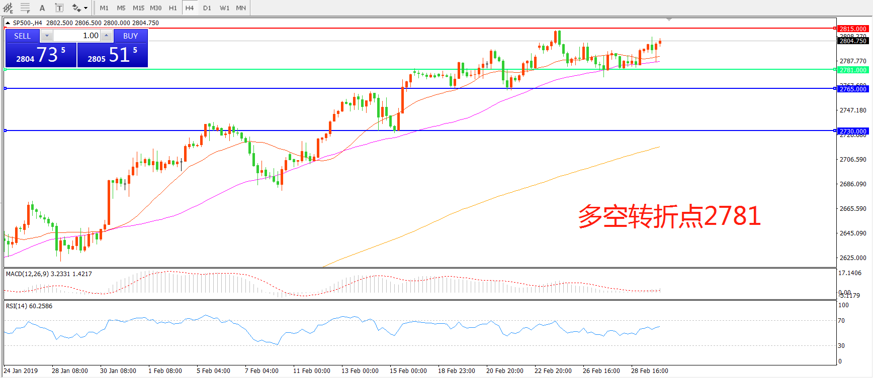 4小时图看,SP500高位震荡后振幅逐渐收窄,21均线与55均线逐渐粘合,MACD红柱减少,RSI指标走平,重点关注2781一线支撑。