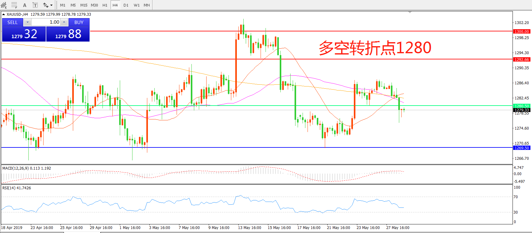 4小时图看,金价反弹至1285附近遇阻,均线系统粘合形成阻力, MACD红柱减少,RSI指标走平,反弹动能偏弱,但整体依然以宽幅震荡思路对待,1280依然是下一阶段的争夺点。