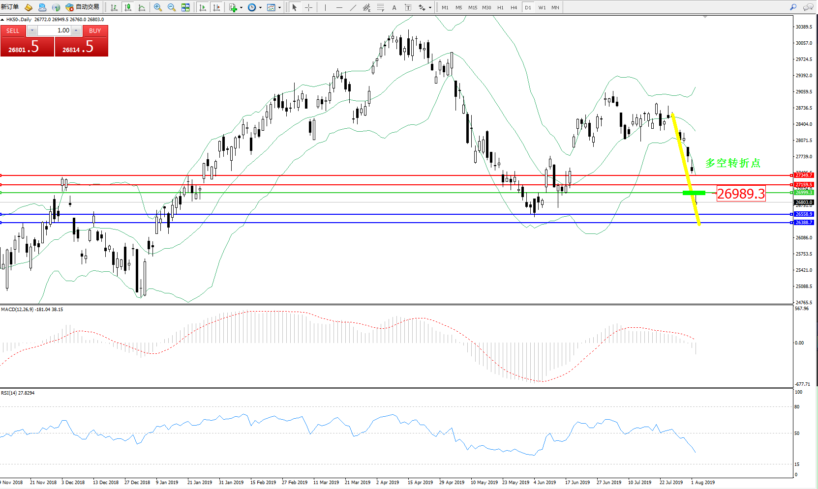 香港恒生指数8月2日(周五)收盘下跌647.12点,跌幅2.35%,报26918.58点;外围市场方面,受特朗普再对中国加征关税的影响,美股大幅上涨后又大幅回落。A50期指收盘大跌近3%。恒生指数低开逾2%,跌破27000点关口,随后震荡上升,美股的负面情绪这几日都准确蔓延到香港市场,打击港股表现,又有风险言论传出影响市场信心,多重利空因素之下,相信市场仍会维持弱势。