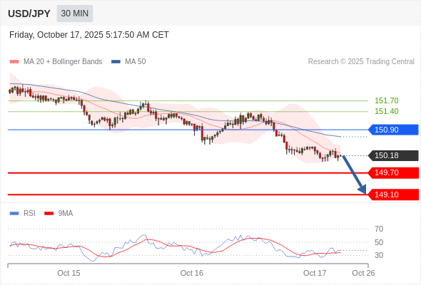 在 150.90 之下,看跌,目标价位为 149.70 ,然后为 149.10 。