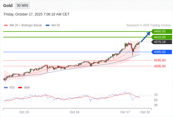 在 4305.00 之上,看涨,目标价位为 4410.00 ,然后为 4450.00 。