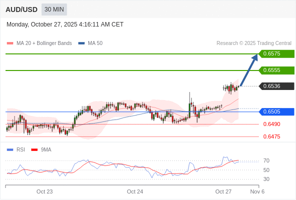 在 0.6505 之上,看涨,目标价位为 0.6555 ,然后为 0.6575 。