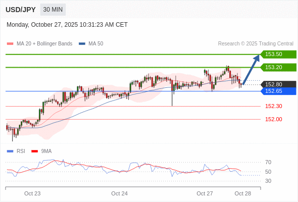 在 152.65 之上,看涨,目标价位为 153.20 ,然后为 153.50 。