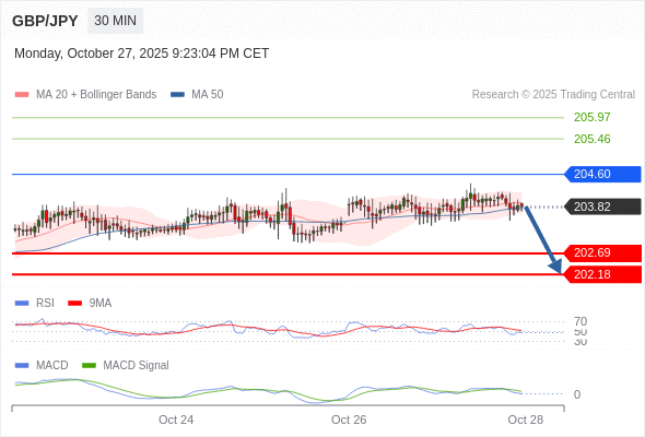交易策略:逐渐下跌,当 204.60 阻碍上行,则 202.18 为目标位。
