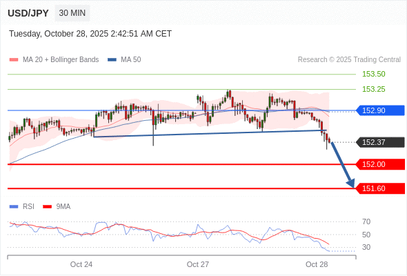 在 152.90 之下,看跌,目标价位为 152.00 ,然后为 151.60 。