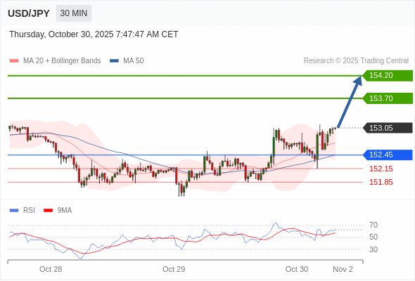 在 152.45 之上,看涨,目标价位为 153.70 ,然后为 154.20 。