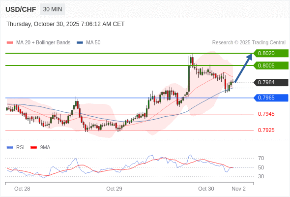 在 0.7965 之上,看涨,目标价位为 0.8005 ,然后为 0.8020 。