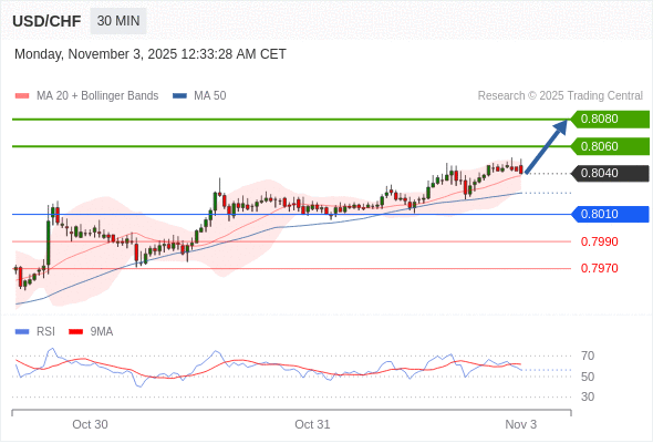 在 0.8010 之上,看涨,目标价位为 0.8060 ,然后为 0.8080 。