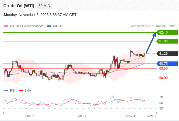 在 60.75 之上,看涨,目标价位为 61.95 ,然后为 62.40 。