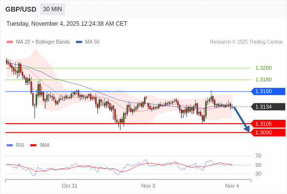 在 1.3160 之下,看跌,目标价位为 1.3105 ,然后为 1.3090 。