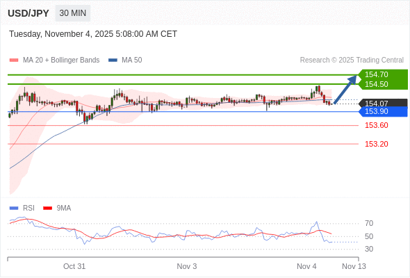 在 153.90 之上,看涨,目标价位为 154.50 ,然后为 154.70 。