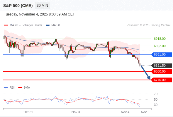 在 6861.00 之下,看跌,目标价位为 6800.00 ,然后为 6770.00 。