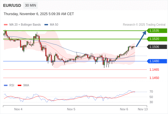 在 1.1480 之上,看涨,目标价位为 1.1520 ,然后为 1.1535 。