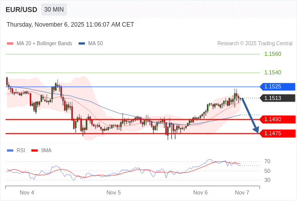 在 1.1525 之下,看跌,目标价位为 1.1490 ,然后为 1.1475 。