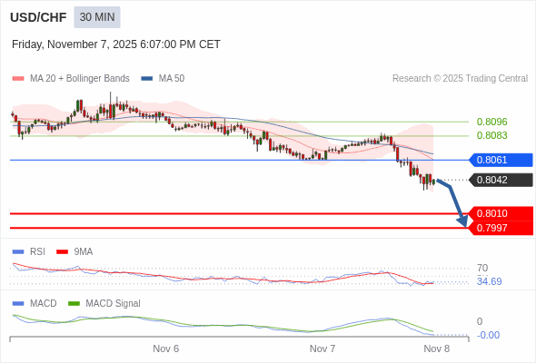 美元/瑞郎 当日内 : 看跌,在 0.8061 之下。