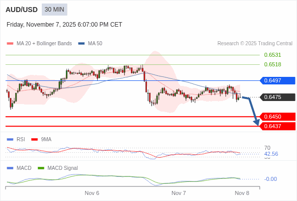 澳元/美元 当日内 : 看跌,在 0.6497 之下。