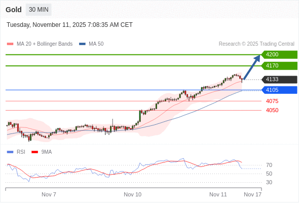 在 4105 之上,看涨,目标价位为 4170 ,然后为 4200 。
