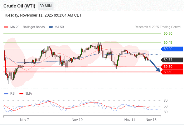 在 60.20 之下,看跌,目标价位为 59.50 ,然后为 59.30 。