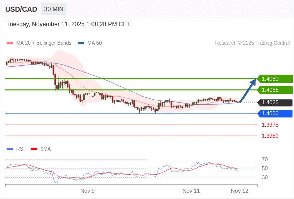 在 1.4000 之上,看涨,目标价位为 1.4055 ,然后为 1.4080 。