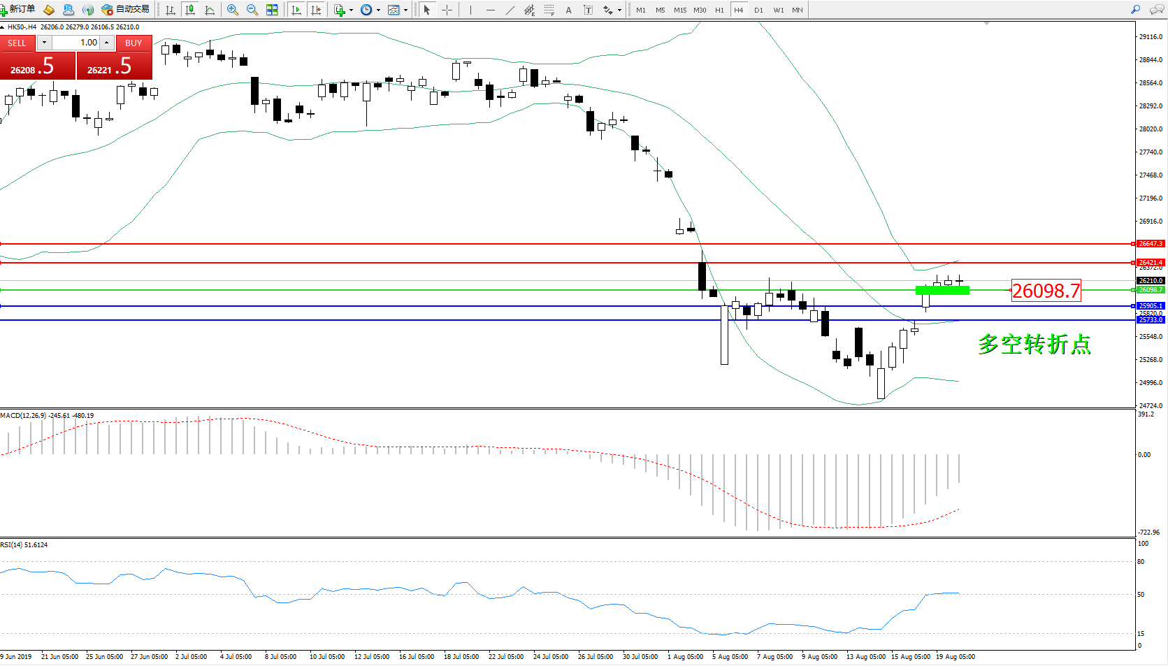香港恒生指数8月20日(周二)收盘下跌60.30点,跌幅0.23%,报26231.54点;恒指 早上跟外围造好而高开260点。随后再扩大升幅至最多升504点,恒指重上26000关口,高见26239。市场对全球经济衰退的担忧依然占据主流。美债收益率倒挂,全球央行未来或继续降息、降息甚至重启量化宽松政策,都使得市场负面情绪升温。市场憧憬美联储下月将再次降息,或为挽救经济退出宽松货币政策。近期恒指累跌不少,外围以及本地因素仍然难测。过去两个月的连串事件,已令大部分投资者对后市看法变得相当审慎。