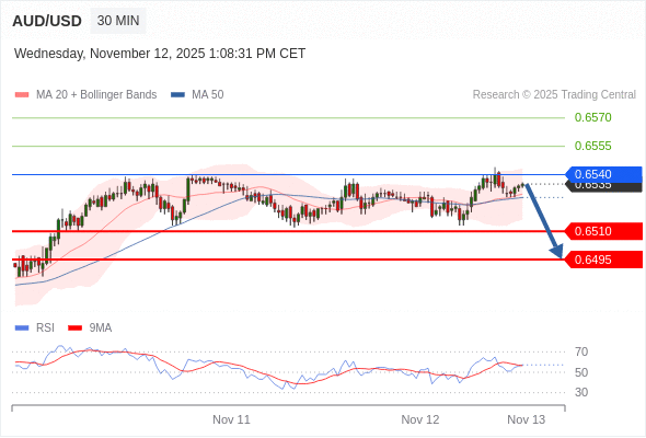 在 0.6540 之下,看跌,目标价位为 0.6510 ,然后为 0.6495 。