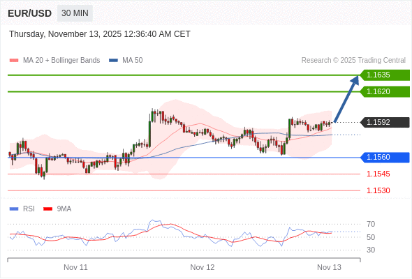 在 1.1560 之上,看涨,目标价位为 1.1620 ,然后为 1.1635 。