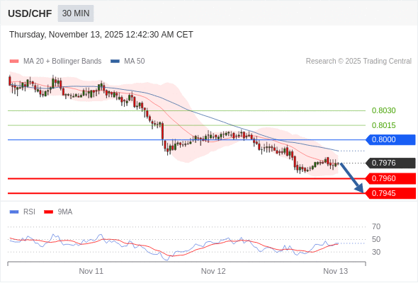 在 0.8000 之下,看跌,目标价位为 0.7960 ,然后为 0.7945 。