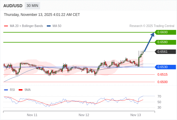 在 0.6530 之上,看涨,目标价位为 0.6580 ,然后为 0.6600 。