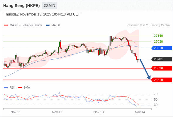 在 26910 之下,看跌,目标价位为 26530 ,然后为 26310 。