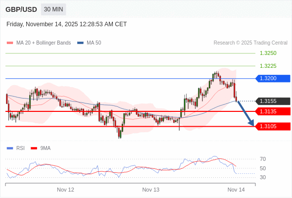 交易策略: 在 1.3200 之下,看跌,目标价位为 1.3135 ,然后为 1.3105 。