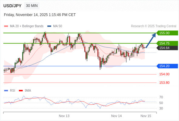 在 154.20 之上,看涨,目标价位为 154.75 ,然后为 155.00 。