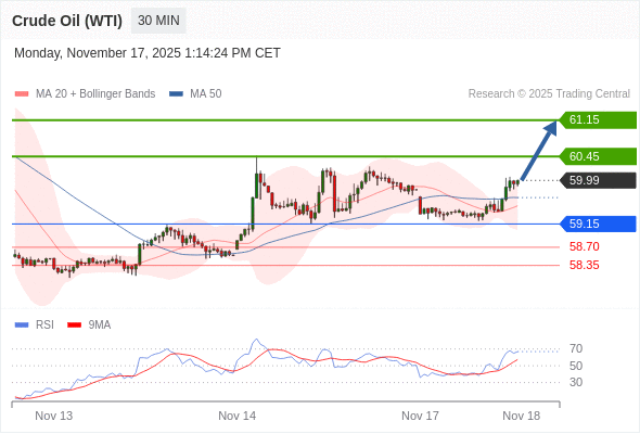 在 59.15 之上,看涨,目标价位为 60.45 ,然后为 61.15 。