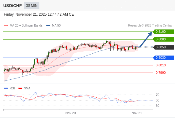 在 0.8030 之上,看涨,目标价位为 0.8080 ,然后为 0.8100 。
