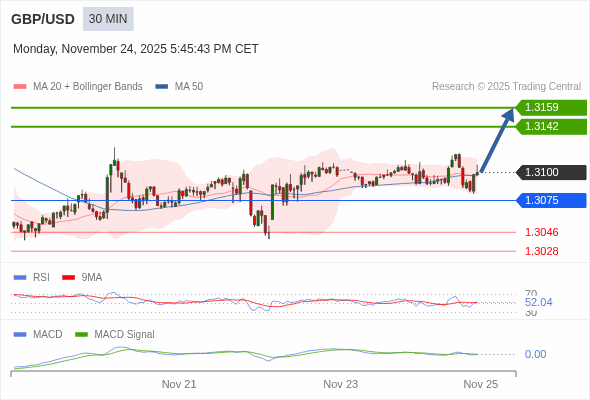 交易策略: 看涨,当 1.3075 为支撑位,目标定在1.3159。