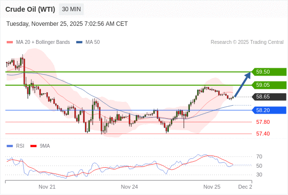 在 58.20 之上,看涨,目标价位为 59.05 ,然后为 59.50 。