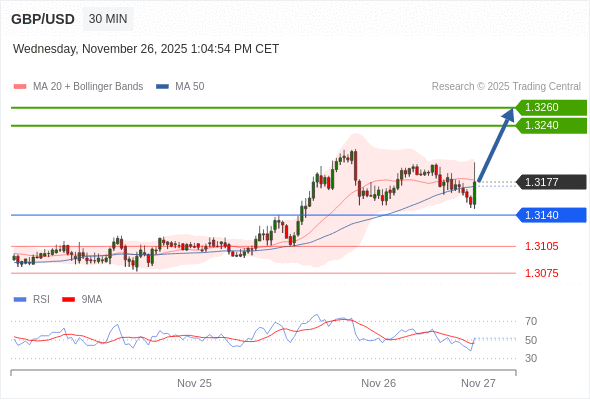 在 1.3140 之上,看涨,目标价位为 1.3240 ,然后为 1.3260 。