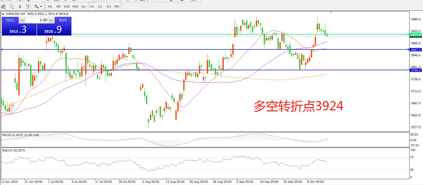 4小时图看,沪深300延续冲高回落走势,3924一线并未守住,均线系统走平,MACD绿柱缩短,RSI指标向下,日内延续震荡概率较大。