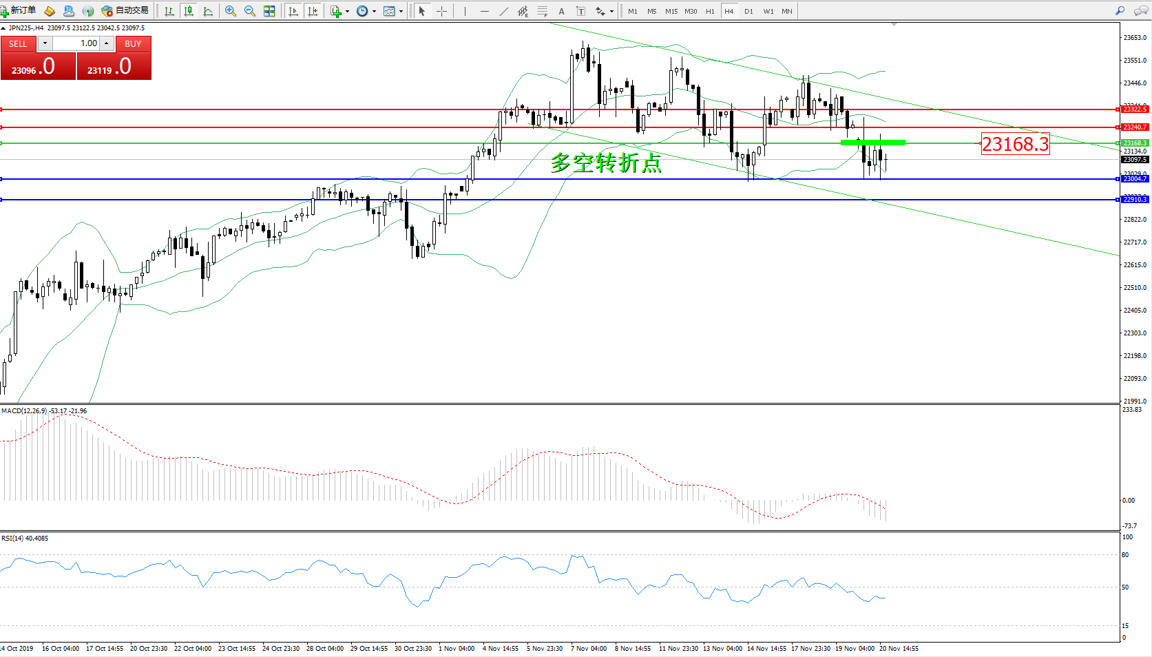 日经225指数1120日(周三)收盘下跌155.65点,跌幅0.67%,报23137.00点。日本经济再生大臣西村康稔:首相安倍晋三指示使刺激计划规模化,支持无线5G将成为国家项目,税收政策应该支持初创企业和并购企业,希望日本企业使用现金储备投资,国内需求稳定,但消费税上调影响消费者,想要对当地小型企业提供支持,关注制造商减少招聘,全球经济影响日本的产出、出口和就业,贸易因素重压全球需求,从而影响日本生产,对经济正在复苏的看法没有改变,希望更多国家能加入跨太平洋伙伴关系协定(TPP),包括美国,希望英国在离开欧盟后可以加入跨太平洋伙伴关系协定。
