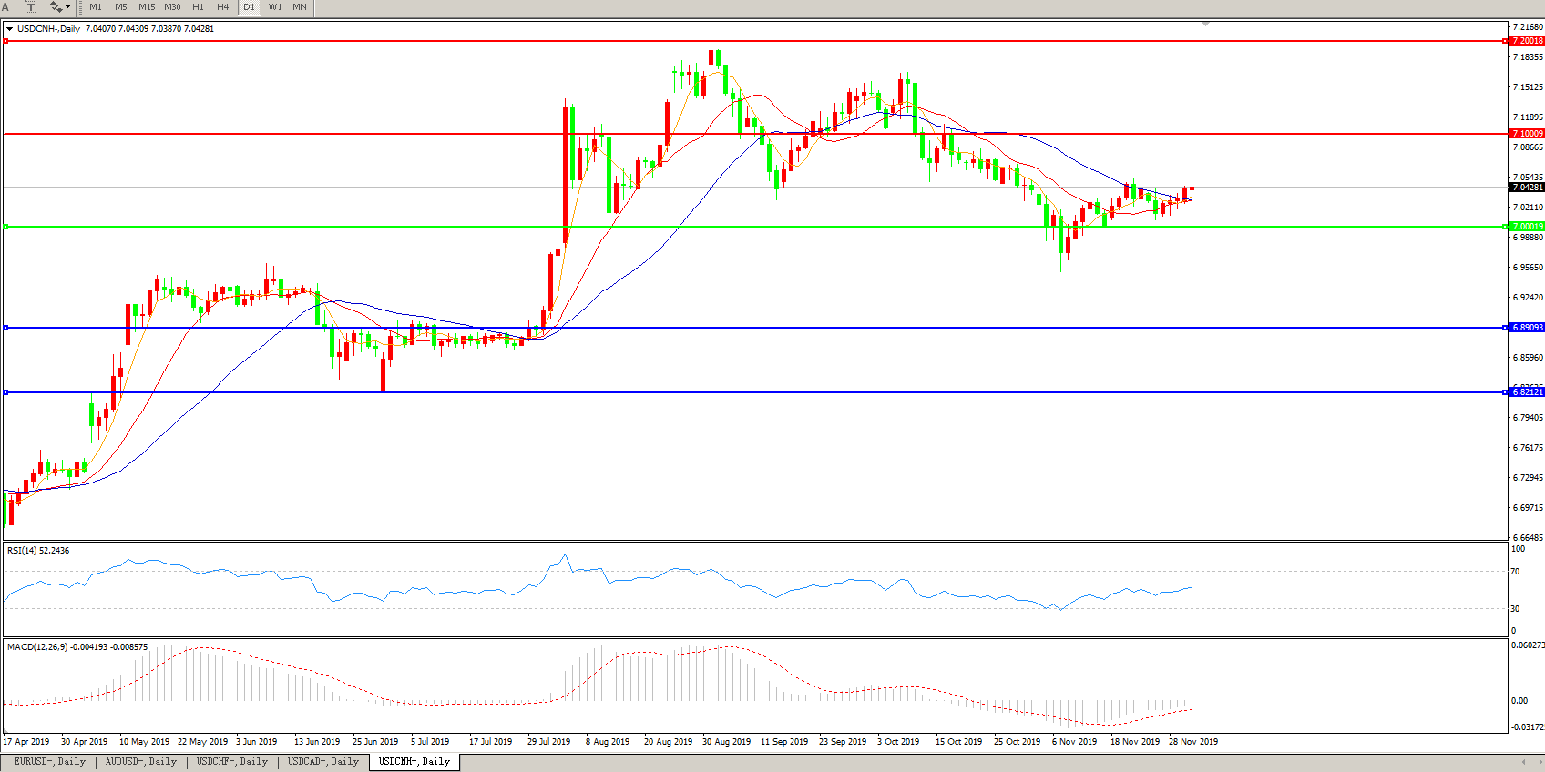 技术面简析:日图均线粘合无明显方向,汇价7.0关口上方偏强整理,MACD运行于0轴下方但量能持续收缩,RSI整理中缓步走升,预计短期汇价将在7.0关口附近整理,中期汇价需等待中美贸易谈判最新进展指引。