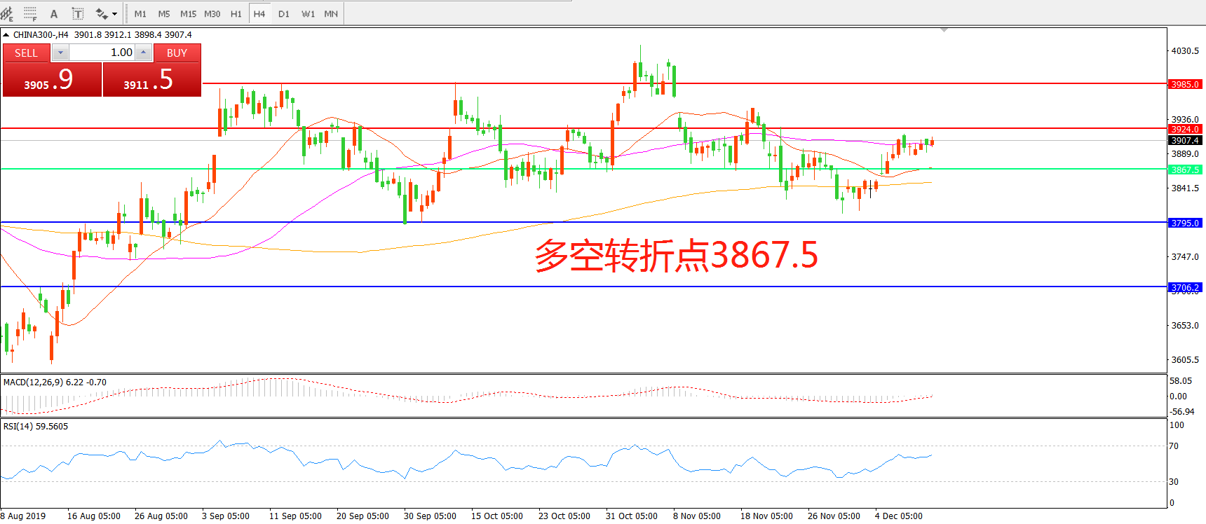 4小时图看,沪深300阳线维持窄幅震荡,均线系统走平,MACD绿柱缩短,红柱增加,RSI指标向上,日内震荡上行概率较大。