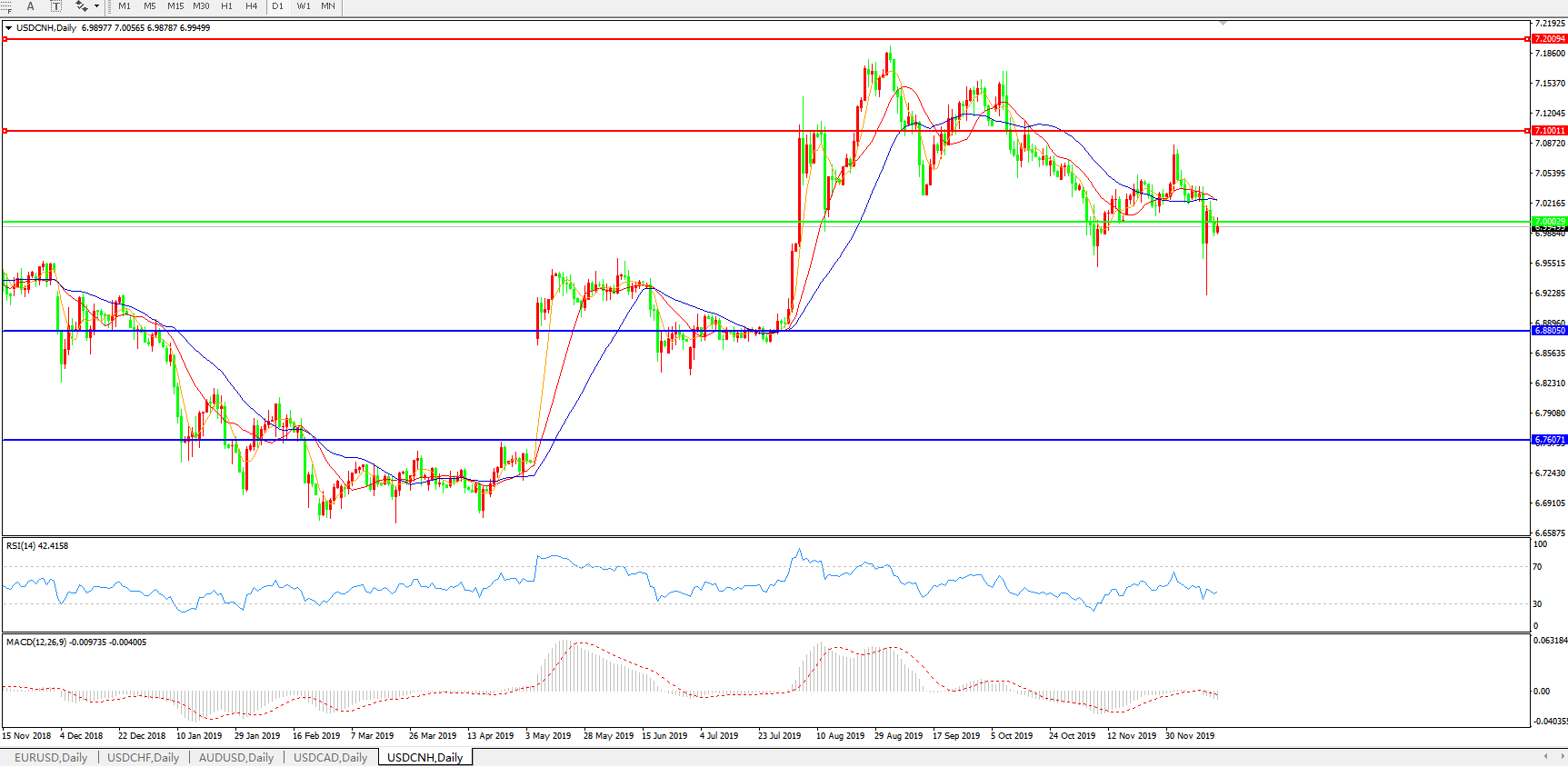 在岸人民币周一收跌近190点并失守7元整数关口,中间价则劲升创逾四个月新高。交易员称,此前各界企盼的贸易利多消息终于落地,但这却引发了多头资金在利多出尽之后的获利离场,午后购汇客盘增多亦令汇价承压;短期人民币或继续在7元附近整固。 交易员指出,在消息面预期最终尘埃落定后。短期人民币汇率暂时缺少进一步消息指引,交易的内生逻辑重新回到宏观经济走势、临近年底客盘刚性的结汇需求等方面。基于当前消息面背景,人民币在7元附近是合理水平。隔了一个周末,市场情绪已经消化的差不多了,在没有新消息的情况下,乐观的情绪会延续。 此外,中国方面周一发布了11月国民经济综合运行数据,各项数据总体符合预期,市场仍预期2020年中国经济将增长6%左右。