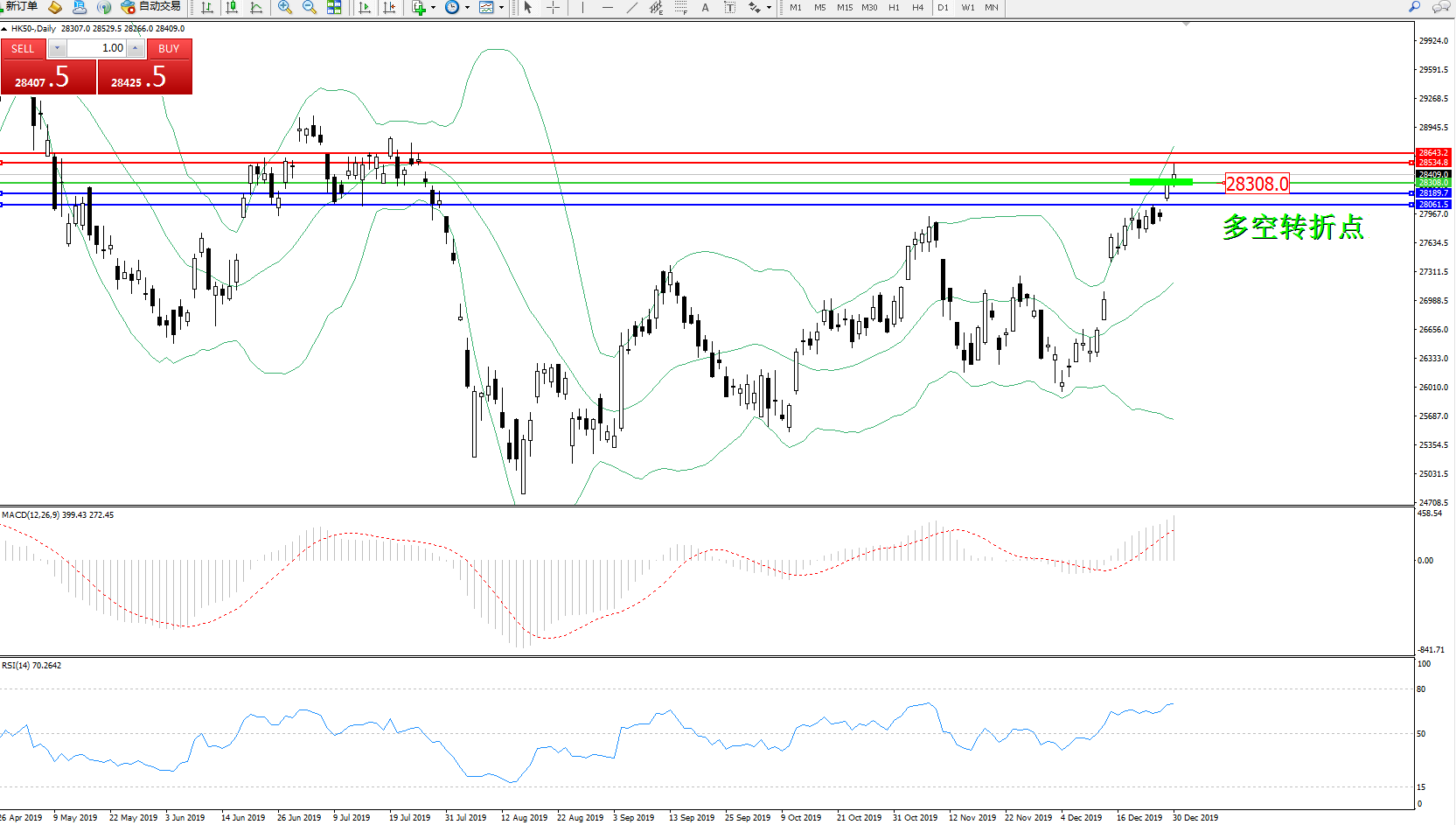 香港恒生指数1230日(周一)收盘上涨93.97点,涨幅0.33%,报28319.39点;港股早上小幅高开25点后,略呈沽压而回落倒跌60点,恒指低见28165。唯低位有买盘支持,反弹再倒升,最高见28418,随后续在高位横行。市场已对第一阶段协议形成良好预期,接下来将憧憬更进一步的发展。隔夜美国股市在2019年辉煌一年的倒数第二天走低,投资者在假期前夕市场淡静之际谨慎行事。此外,由于美联储处于按兵不动的状态,而且美国贸易谈判似乎距离新突破还很遥远,因此交易员可能仍然不愿重新投入高风险市场。