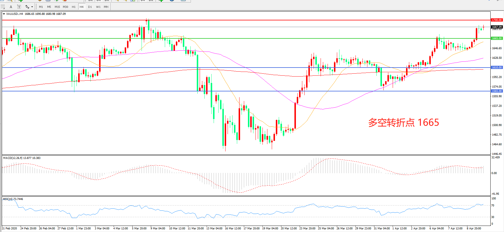 上周美联储宣布新一轮大规模刺激举措,且美联储主席鲍威尔讲话重申美联储将继续使用一切可用的工具来支持美国经济。美联储不断推出新的刺激手段,意味着通胀将会走高,对黄金是一大利好,周一(4月13日)凌晨,OPEC达成减产协议的消息一度提振市场,现货黄金突破1690美元后震荡回落,收报1686.18美元/盎司。
