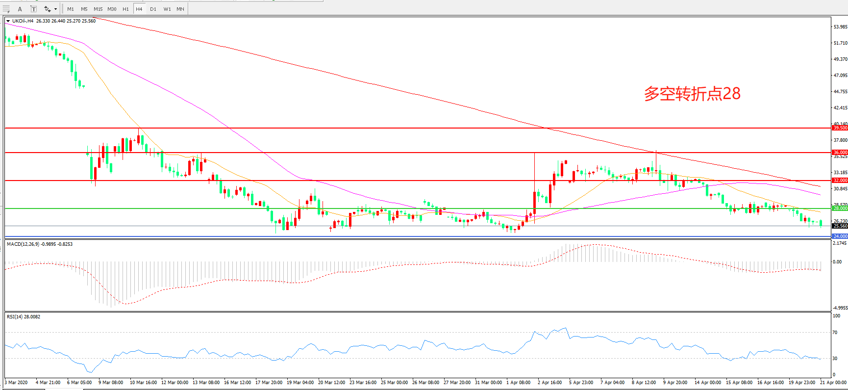 4小时图看,油价震荡下行,整体走势偏弱,24美元成为短期支撑,28美元成为短期阻力,均线系统走平,MACD绿柱增加,RSI指标走平,日内延续震荡概率较大。