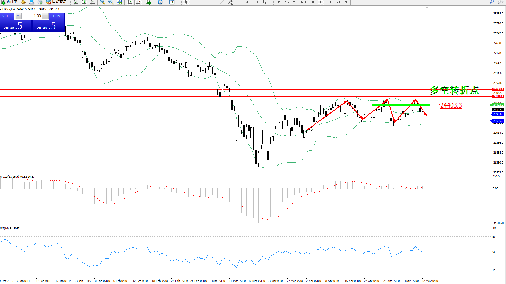 香港恒生指数5月12日(周二)收盘下跌356.38点,跌幅1.45%,报24245.68点;港股市场三大指数均大跌超1.4%。早盘恒指走高已经触及到本轮反弹的高位,午后受压回落,表明上方压力较大,当前重点关注24850附近的压力,中石油、中石化跌近3%,三大电信股皆跌超1.5%,太古股份公司大跌4.64%领跌蓝筹;医疗设备、乳制品逆势走强,微创医疗大涨超10%创新高,春立医疗、爱康医疗皆升超8.6%。主板成交额不足千亿港元,南下资金逆势净流入28.52亿港元。市场憧憬经济重启,恒指向上突破有难度。腾讯昨天收到京东可能来港上市消息带动股价破顶,今天则再度回调超过2%。