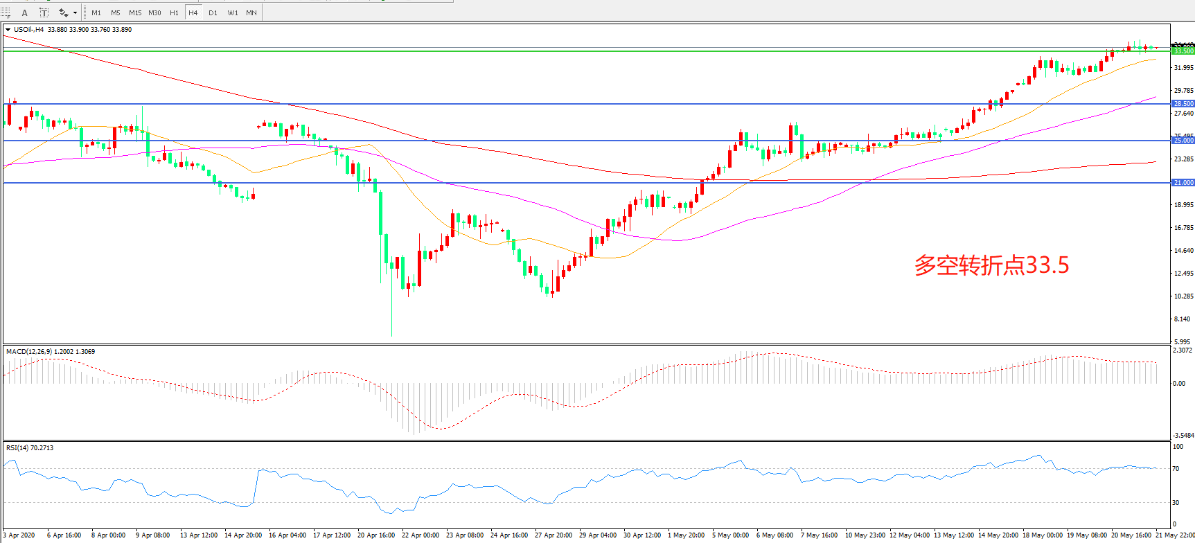 周四(5月21日),受美国原油库存下降、 OPEC牵头的减产的提振,油价延续震荡上行,美国WTI原油突破34美元一线后陷入整理,收报33.8美元/桶,有消息人士称,OPEC并未排除采取进一步措施支撑市场的可能性。