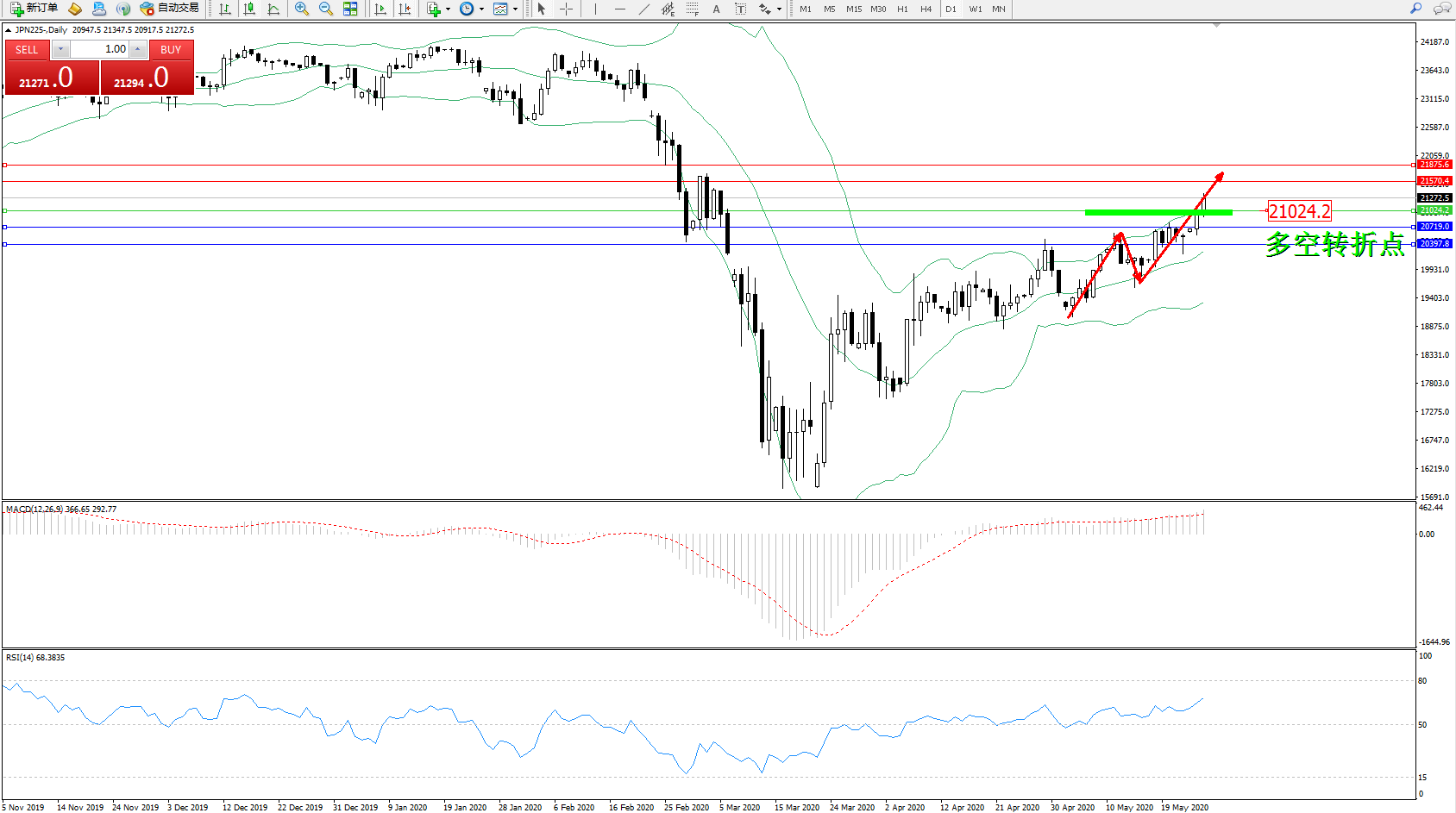 日经225指数526日(周二)收盘上涨544.85点,涨幅2.63%,报21286.50点。日本央行行长黑田东彦: 日本央行将积极购买国债,从经济、金融状况来看,日本央行当前的收益率目标水平是合适的,如果我们需要进一步降低收益率曲线,我们将根据需要调整国债购买量,由于市场对日本财政的信心,日本利率稳定,日本央行能够在收益率曲线控制(YCC)之下维持长期利率在低位,因为市场信任日本保持中期利率的决心和维持长期财政健康,即便疫情受控,人们的生活方式也很难回到疫情前,尤其是服务行业发生了重大变化,不认为日本会陷入通货紧缩,同样通胀也不会加速上行太多,预计日本经济在本季度将比一季度遭受更大的收缩,日本经济可能在第二季度萎缩更多,日本央行的预测显示,日本不会陷入通货紧缩,正如持续的价格下跌所定义的那样,但也不会看到通货膨胀加速。