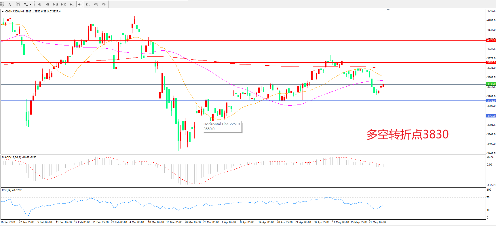 4小时图看,沪深300高开高走,短期走势有所回暖, 3830成为短期多空分水岭,均线系统走平, MACD绿柱增加,RSI指标向上,日内延续震荡概率较大。