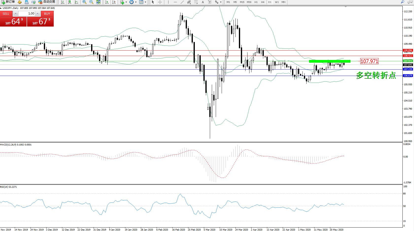 美元兑日元跌0.06%107.65,接近盘中低点,日本政府5月维持整体经济评估不变,称经济因疫情而处于“极度严峻”形势,对出口、劳动市场及企业投资的评估看法悲观。 虽然在日本政府发布月度经济评估报告后,日元汇价略有回升,但总体上,美元与日元在汇市同进同退的格局并未改变,因双方都作为避险货币,受到全球疫情与经济相关消息的带动。而暂时,还没有消息能够彻底消除美元的避险货币属性,因此,美元兑日元上行及下行空间都相对有限,过去一个月来106-108之间横盘区间还将继续维持相当一段时间。